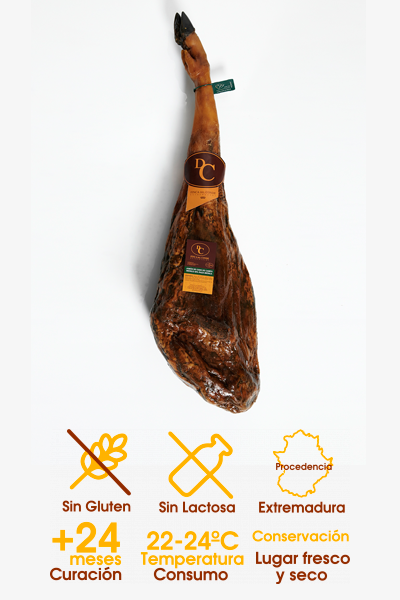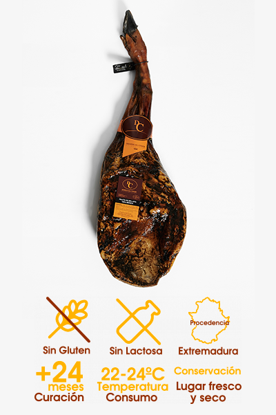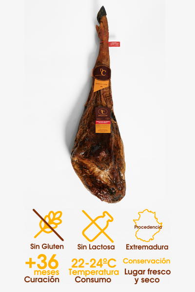 Este producto se obtiene de una selección rigurosa de las materias primas de cerdos blancos Duroc. Con 22 - 24 meses de curación en Calamocha (Teruel), conseguimos un jamón con su punto equilibrado de sal, aromático y con un exquisito sabor. Raza: Duroc 50% (padre Duroc y madre large White)